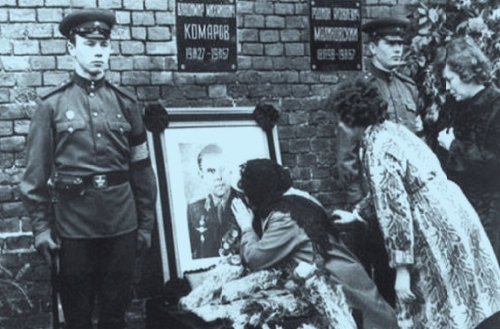 科马洛夫的葬礼于1967年4月26日在莫斯科的红场上举行。图为他的遗孀瓦伦蒂娜·科马洛夫在葬礼上吻别她死去丈夫的照片