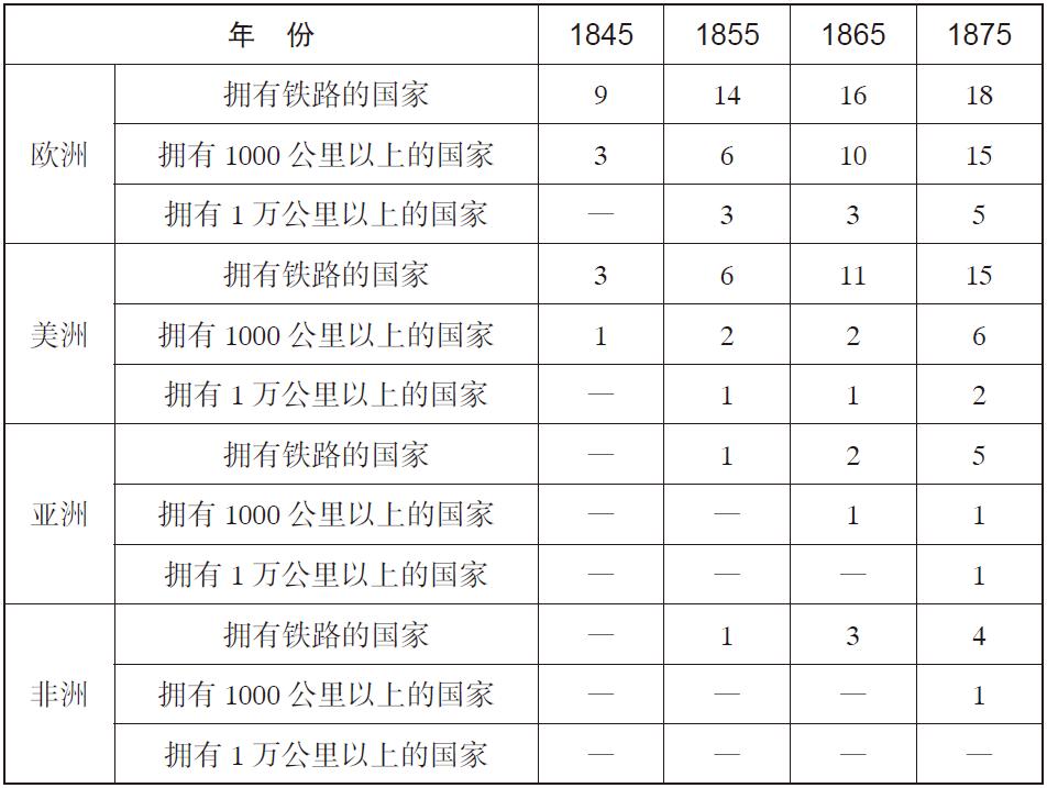 在本书所论时期,在欧洲各地、美国,甚至世界其余部分的少数地区,都可以看到这种长距离铁路网的建设。我们可从以下两个表格中看出这项发展。1845年,在欧洲以外,拥有铁路线的“低开发”国家只有古巴。及至1855年,世界五个大陆上都已铺设铁路,尽管南美(巴西、智利、秘鲁)和澳大利亚还未出现。到1865年,新西兰、阿尔及利亚、墨西哥和南非也有了它们的第一条铁路。到1875年,巴西、阿根廷、秘鲁和埃及已经铺设了1000英里或更多的铁路,锡兰、爪哇、日本甚至更远的塔希提岛(Tahiti)也已经有了第一条铁路。同时,到1875年,全世界共拥有6.2万部火车头,11.2万节客车车厢和几乎50万吨的货车车厢。据估计,它们共运载了13.17亿名旅客和7.15亿吨货物。换言之,约是这10年间每年海上平均运输量的9倍。就数量而言,19世纪第三个25年是第一个真正的铁路时代。