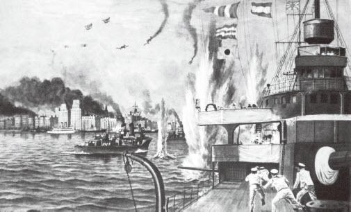 日本油画:1937年淞沪抗战,中国空军击中日本驻华海军旗舰出云号。