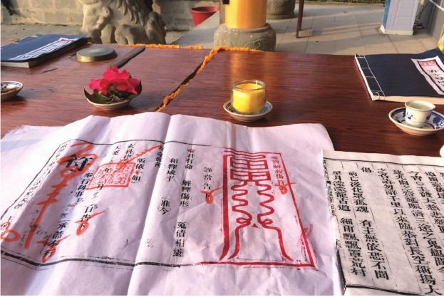 晚间,几位师父在灯下检查坛场的布置。神龛前的花果早就摆好了,有苹果、葡萄、香芒等,经桌上遮了红布,放了两瓶百合。任师父裁叠表筒、写表文,毛笔有些开叉,不太好用,灯线又弱,她写字时扑着身子,离纸张很近才能看清笔画。因为怕写错,所以事先准备了两份表文。观里也准备了两种龙笺[1],一种红纸黄纹,另一种黄纸红纹,样式是常见的双龙戏珠,此次贡天法事,用的是第二种。表文的大部分内容是事先填好的,黄纸红字,还要填写地址、名称、所祈事项、日期等。