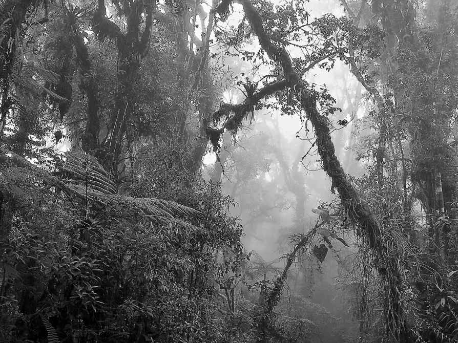 我们向低处走得越远,森林就变得越茂密。树木不再只是树木,而更像是植物园,表面覆盖着蕨类、兰花和凤梨类植物,还缠绕着藤蔓。有些地方植被过于厚重了,以至于在大地上方的空中又形成了一层土壤,其中又有了新的植物扎根,形成一座悬空的森林。在这里,每一缕阳光和每一块空间都被占用了,资源的竞争无疑非常残酷,几乎就像是可以看到自然选择正在实时发生,“每时每刻”审查着“每一处变异,即便一丝一毫也不放过”。(关于热带地区多样性丰富的另一种理论就认为,是更剧烈的竞争推动了物种走向更加特化的方向,而更为特化的不同生物才能共同生存在同一处有限的空间中。)走在这里,我能听到鸟类的鸣叫,但却极少能看到它们;因为有林木遮蔽,很难看到动物的踪影。