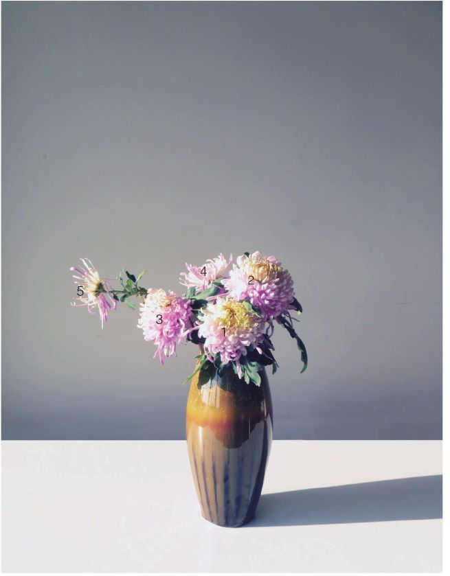 步骤四 在三朵菊花的斜后方插上一枝花头较小的菊花,高度与第二枝菊花相当。