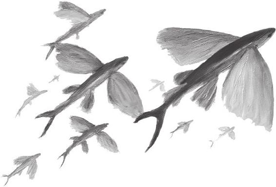 就在那一刻,空气一阵震动,我们遭到了一大群飞鱼的袭击。它们就像一群蝗虫一样拥来。说它们像蝗虫,不仅因为它们数量很多,而且因为它们的胸鳍发出像昆虫一样喀嚓喀嚓、嗡嗡嗡嗡的声音。它们猛地从水里冲出来,每次有几十条,其中有几条嗖嗖地迅速在空中飞出一百多码远。许多鱼就在船面前潜进了水里。不少鱼从船上飞了过去。有些鱼撞上了船舷,发出像燃放鞭炮一样的声音。有几条幸运的在油布上弹了一下,又回到了水里。另一些不那么幸运的直接落在了船上,开始拍打着舞动着身体,扑通扑通地蹦跳着,喧嚷不已。还有一些鱼就直接撞到了我们身上。我站在那儿,没有任何保护,感到自己像圣塞巴斯蒂安一样在乱箭下殉难。每一条鱼撞上我,都像一支箭射进我的身体。我一边抓起一条毯子保护自己,一边试图抓住一条鱼。我浑身都是伤口和青肿。